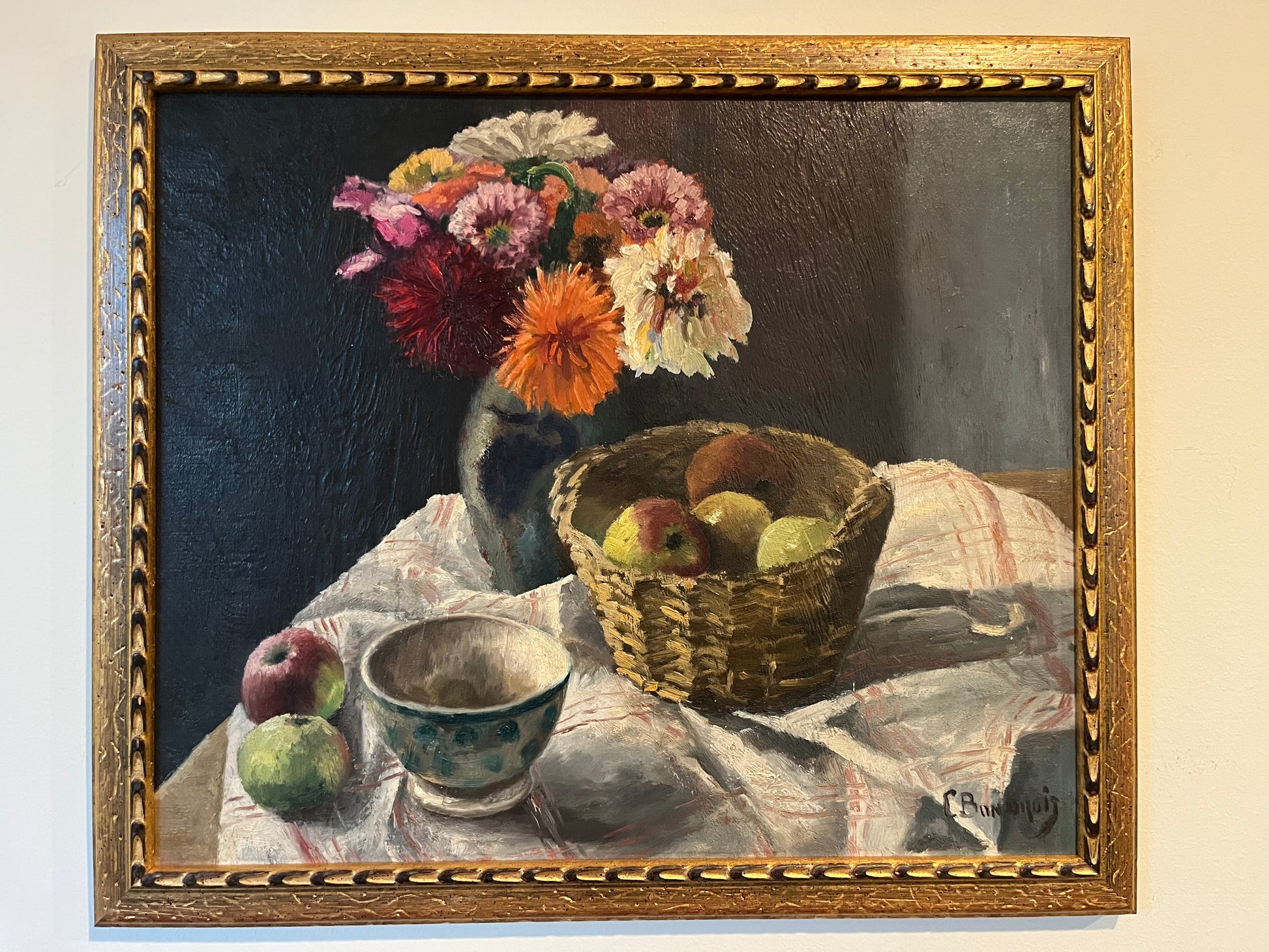 In Still Life, Flowers & Apples, C. Bondrage presents a classic study of form and color that epitomizes the quiet elegance of vintage still life. This oil on board composition features a balanced arrangement of vibrant blossoms and carefully rendered fruit, showcasing the artist's attentive handling of light and natural textures.